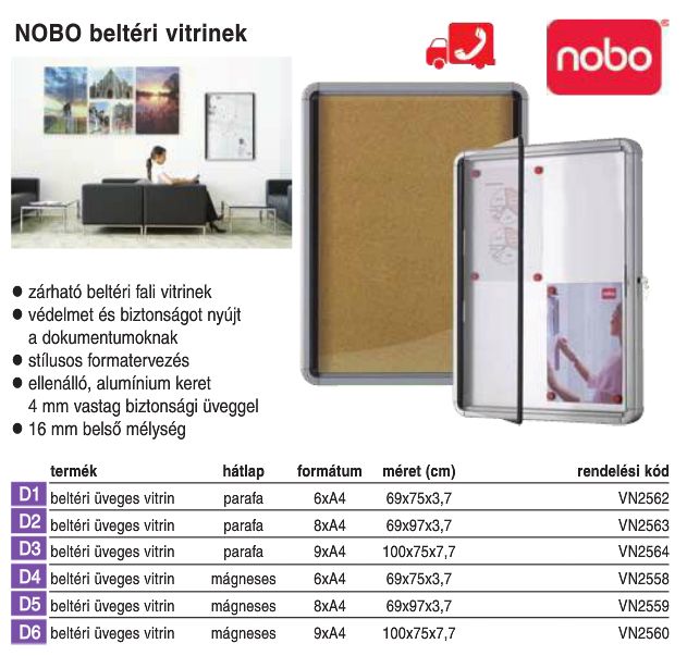 | Zárható tábla vitrin | VN2564 | Tábla vitrin beltéri parafa (9xA4) Nobo | 41 900 Ft | 53 213 Ft | ||